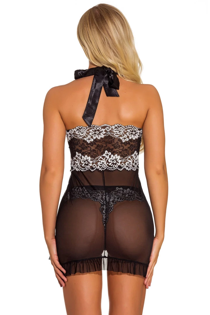 This flirty babydoll features a ruffle, flyaway front, a lace bust with an oversized satin bow applique, halter neck, and matching panty.