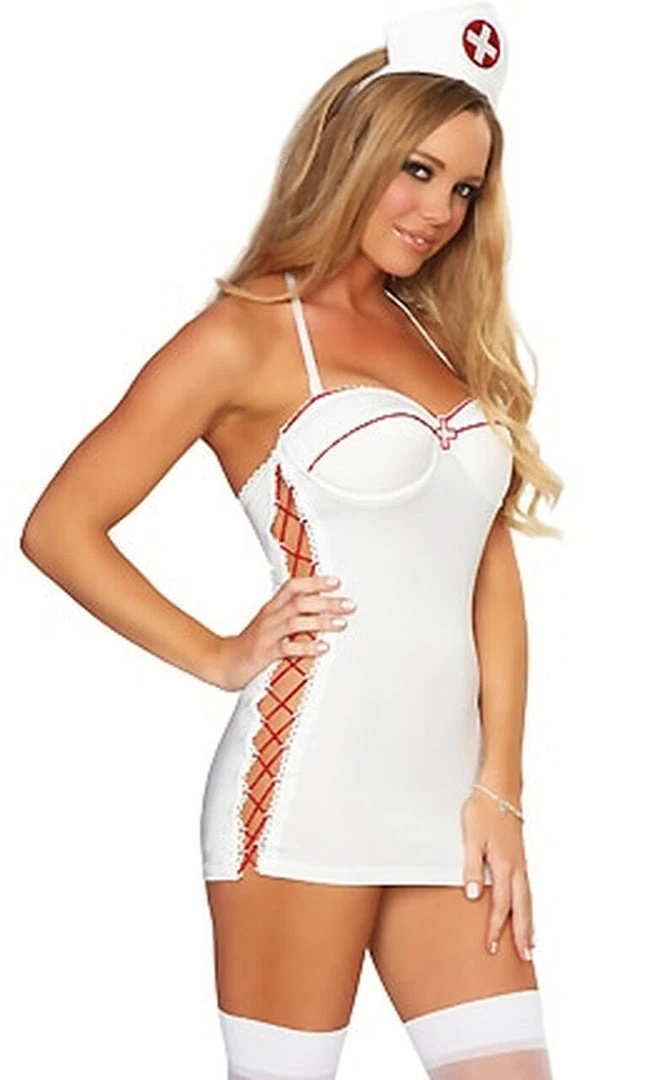 A special night of make believe and romance can be on its way to you with this Naughty Nurse Kinky Care Costume. A gorgeous lingerie set that includes Halter Mini Dress with Lace Up Side Design, Under-wired Padded Cups, and Embroidered Center Cross. Including a matching nurse hat. This lingerie is top quality and guarantees a night of make believe and romance. Get your kinky on and enjoy a very sexy and memorable time while wearing Kinky Care naughty nurse costume.