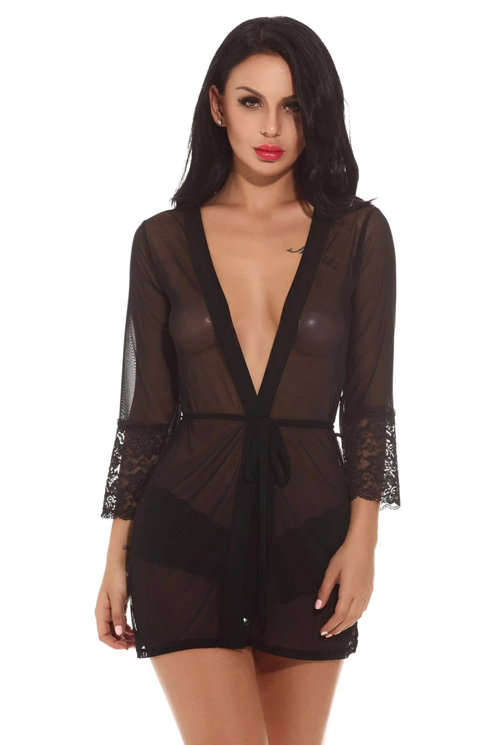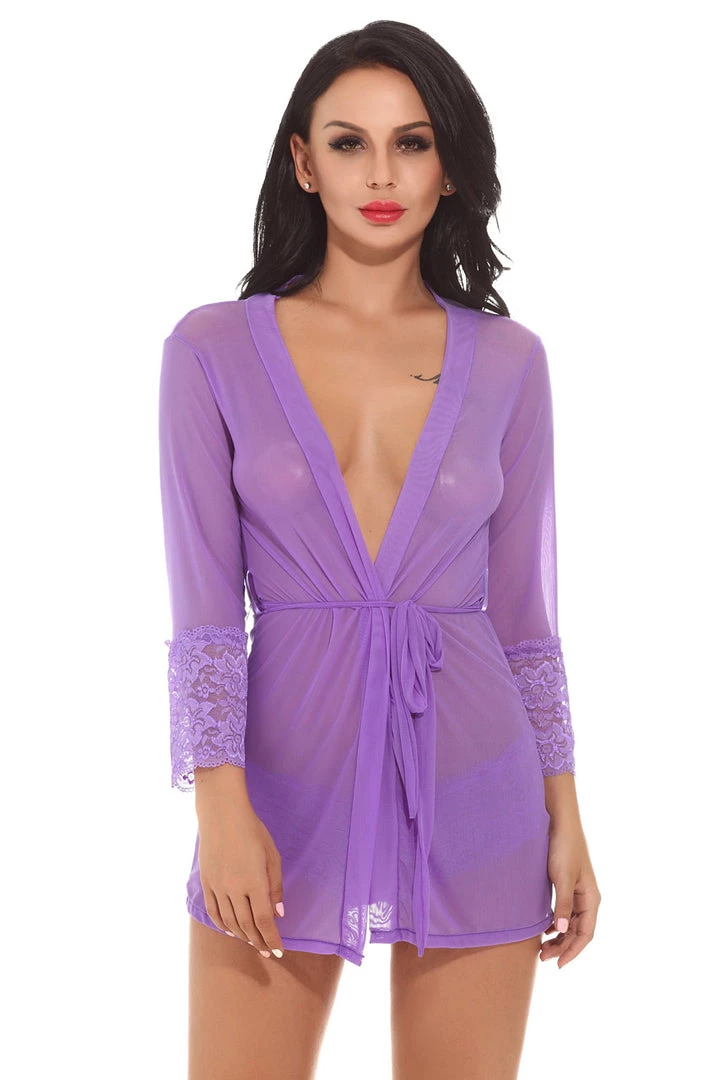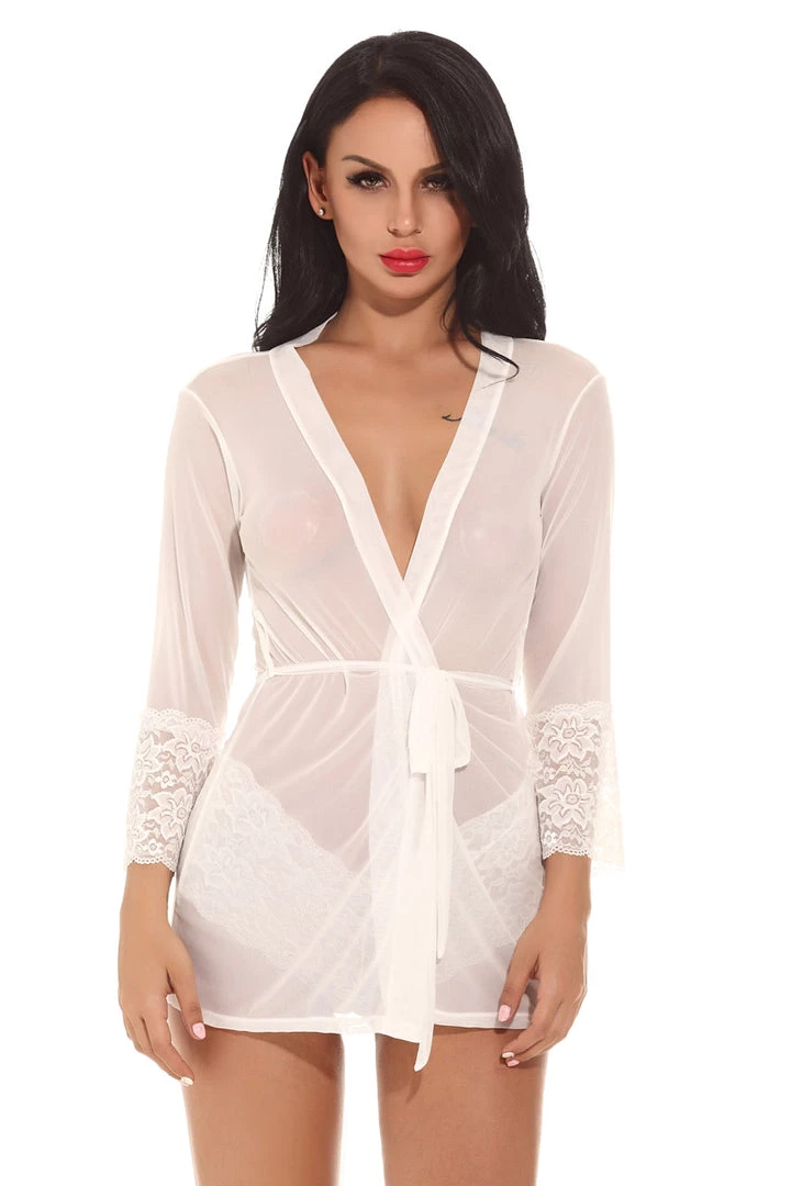 This romantic, sheer desires robe features a mesh robe with lace trim sleeves, a belted middle, and thong.