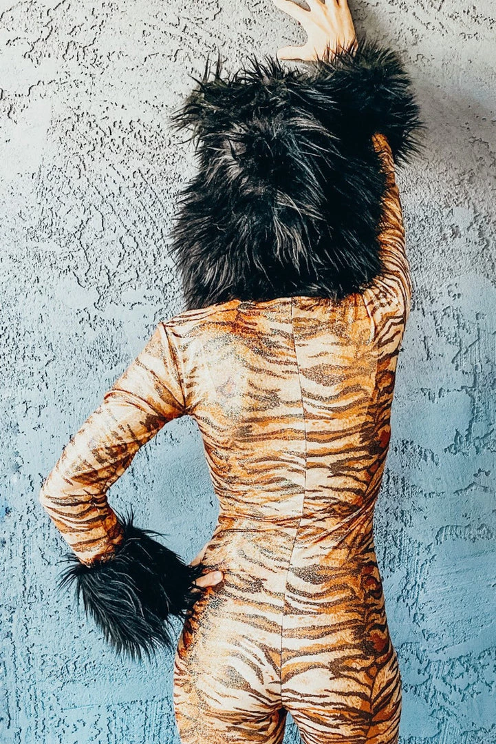 They’re gonna hear you roar in this Metallic Hooded Tiger Costume featuring a metallic, tiger printed catsuit with long sleeves, an attached hood with faux fur trim, an attached tail and a zip up front.