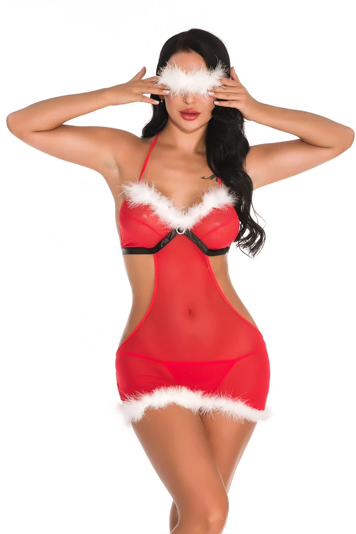 This mistletoe mistress chemise features side cut outs, white marabou feather trim, a halter neck, tie back, faux belt with rhinestone buckle, thong, and feather eye mask.