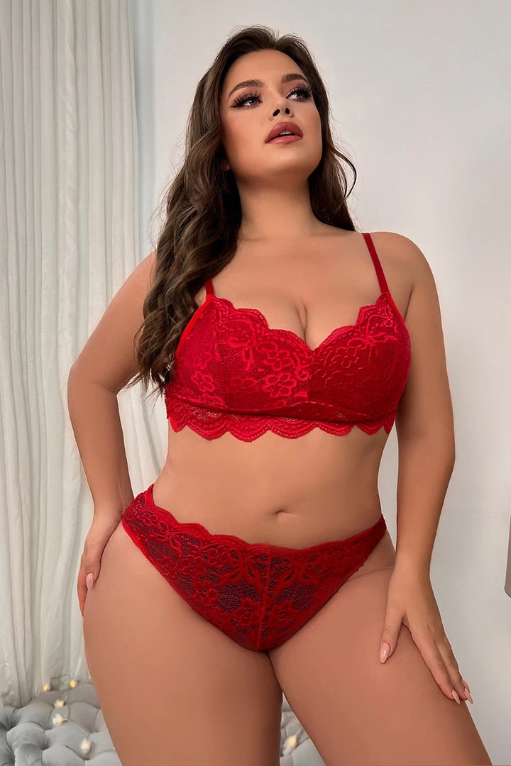 This flirty plus set includes a red bra top with scalloped lace trim and a matching panty with a cheeky back.