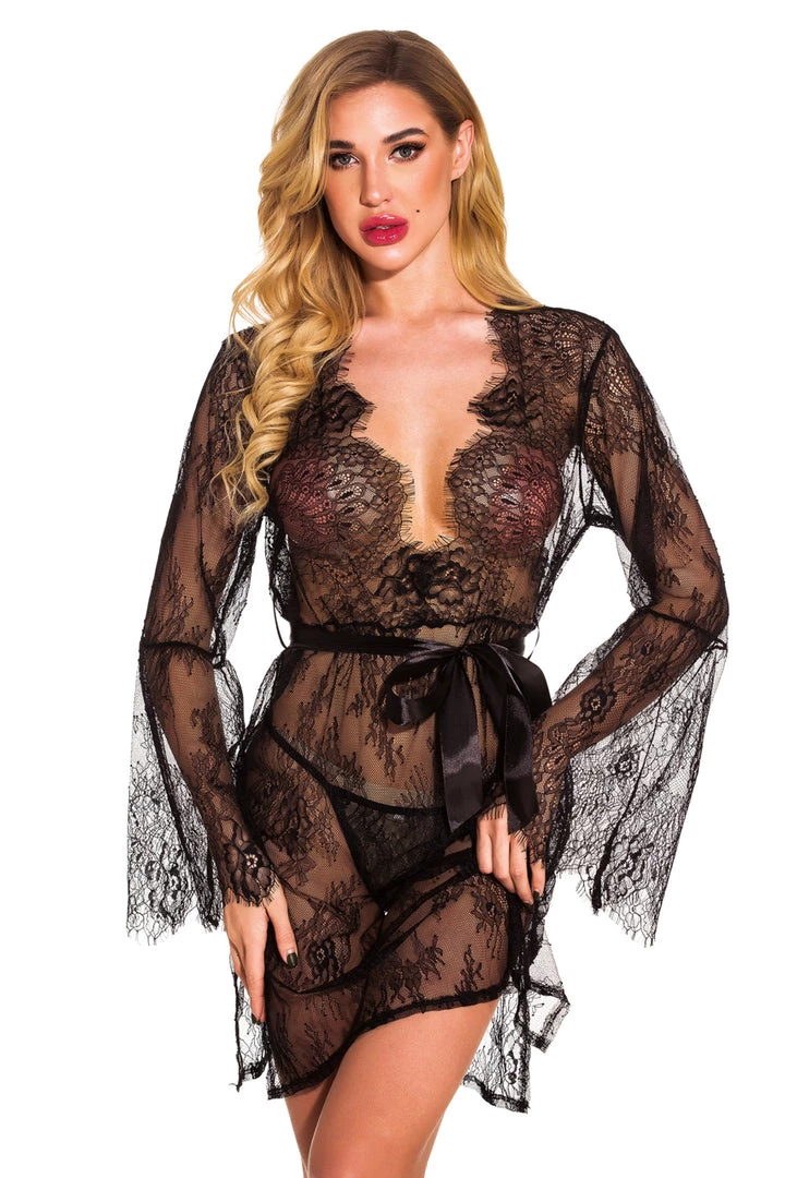 This romantic set includes a black, eyelash lace chemise with long bell sleeves, a low cut bust, sexy side slits, a black satin belted middle, and a matching thong panty.