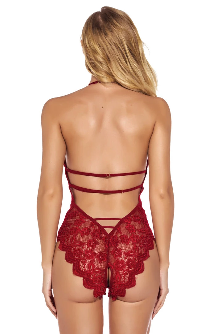 This dark green, scalloped lace teddy features strappy cups, an open crotch, O-ring details, and spaghetti straps.