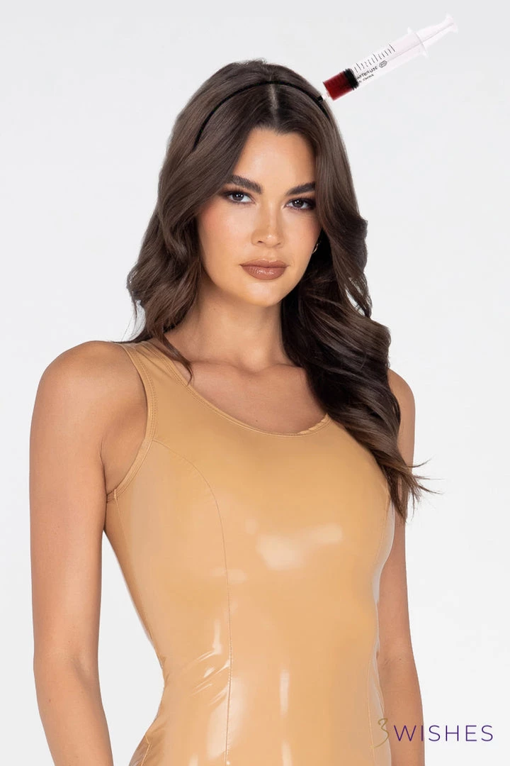 Love it or hate it, have a little fun this Halloween in this Sexy Vaccine costume. This costume includes a nude, wet look mini dress with tank sleeves and a unique, syringe-style headband.