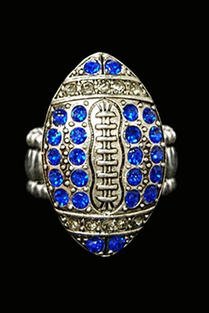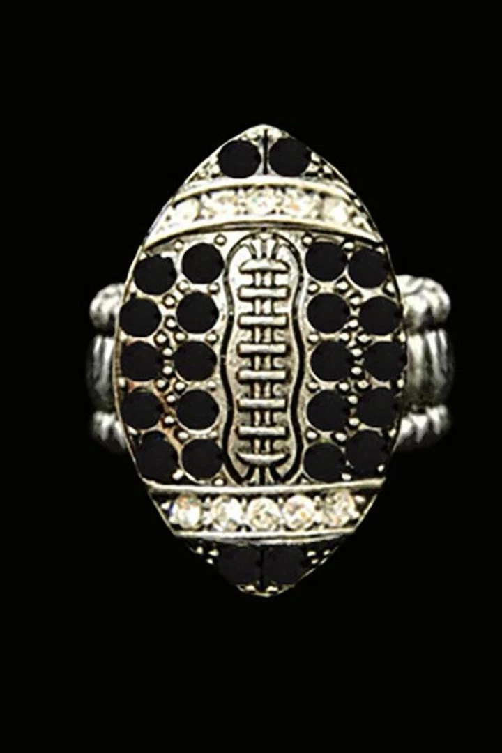 Crystals Encrusted Football Shaped Ring with Stretch Band. Rings are Lead, Nickel, and Cadmium. Made in USA