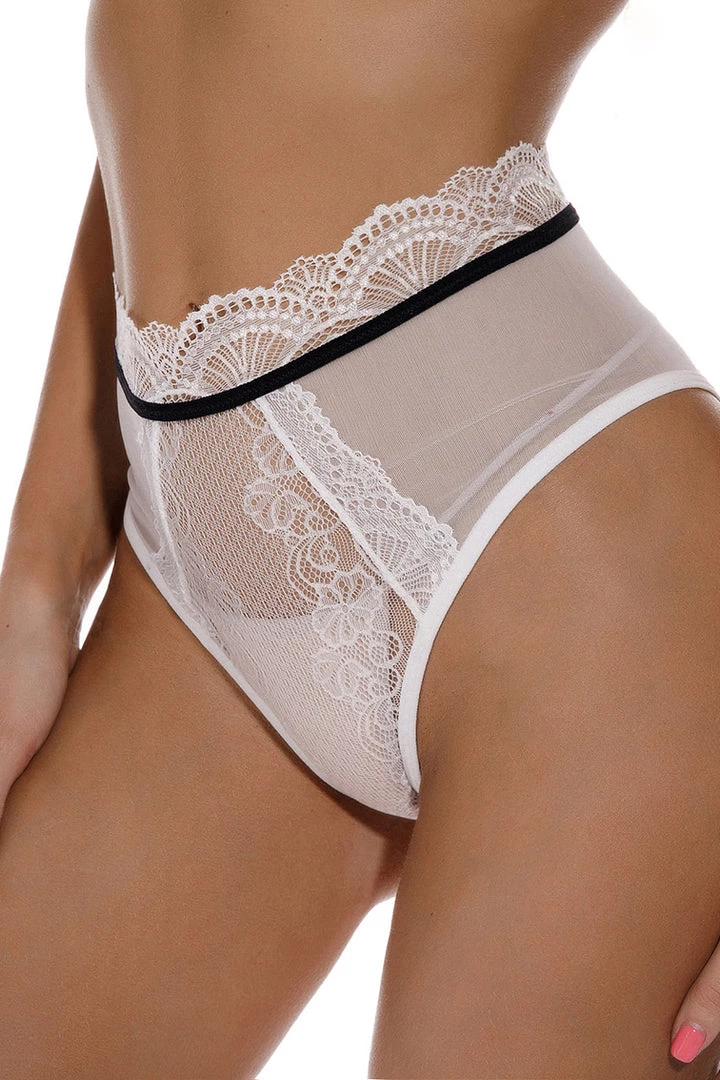 This flirty mesh panty features a cut out lace back and contrast satin ribbon and tie closure.