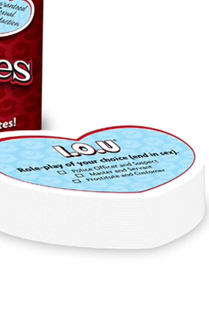 Directions: Once, twice or as often as you’d like indulge yourselves in wild and adventurous sex with IOU Sex Stickies. Let your lover know you’re ready to be frisky by placing a sticky note on the refrigerator, mirror, computer screen, or somewhere they’ll be sure to find it. Once found, your lover can choose from one of the three different sexual scenarios listed on each note before returning the note to you with their desired selection.