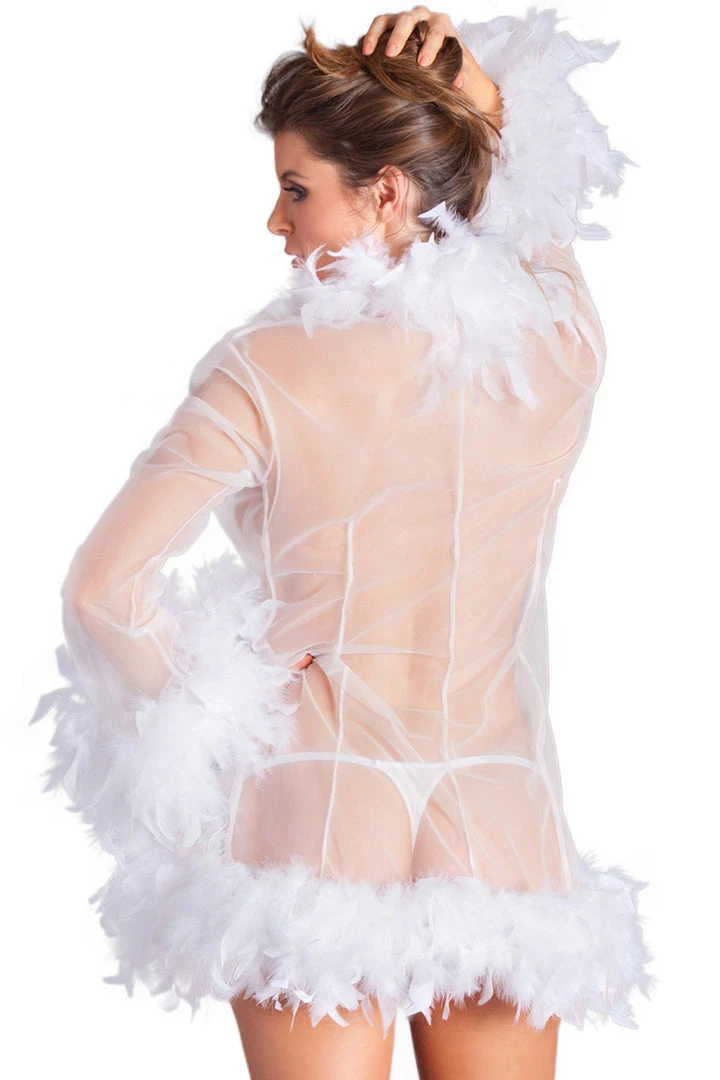 This Glamorous White Sheer Feather Robe features a short sheer robe with chandelle boa feather trim, long sleeves, short cut, and waist belt sash. *Thong panty not included.
