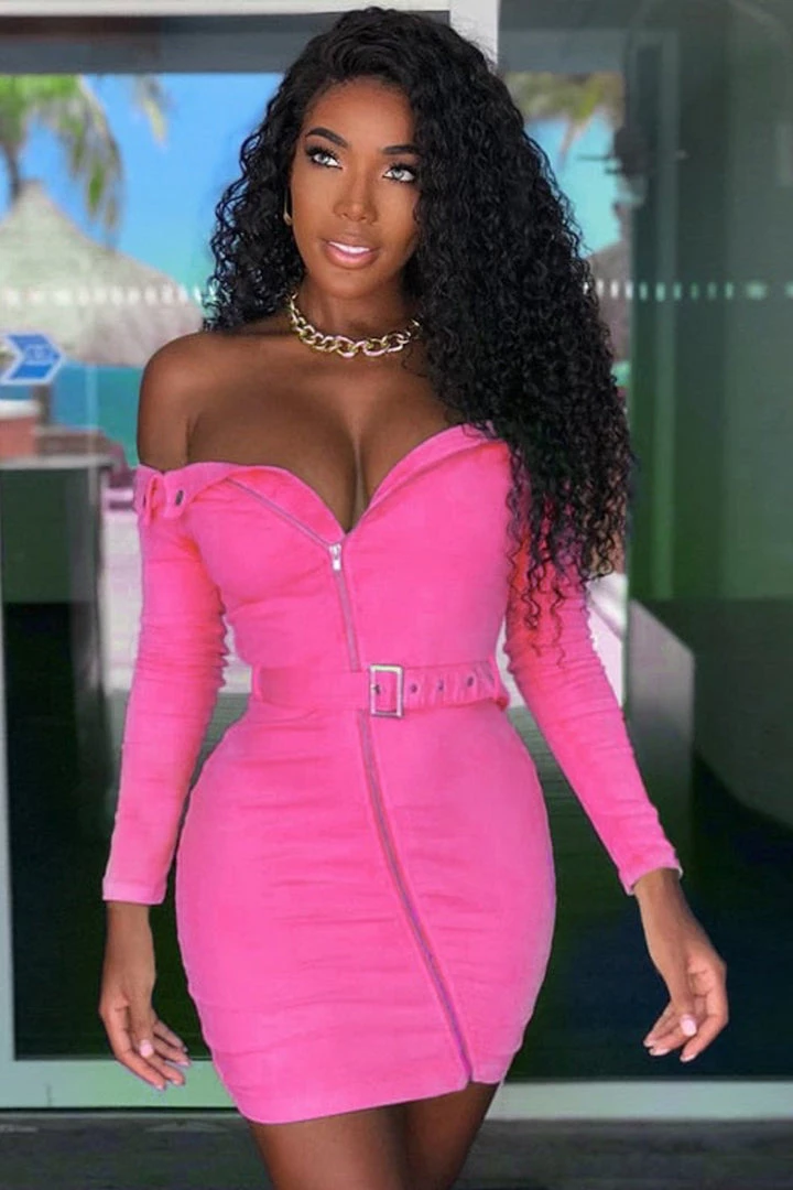 This coat-style mini dress features long sleeves, an off the shoulder silhouette, a zip up front, and a belted middle.