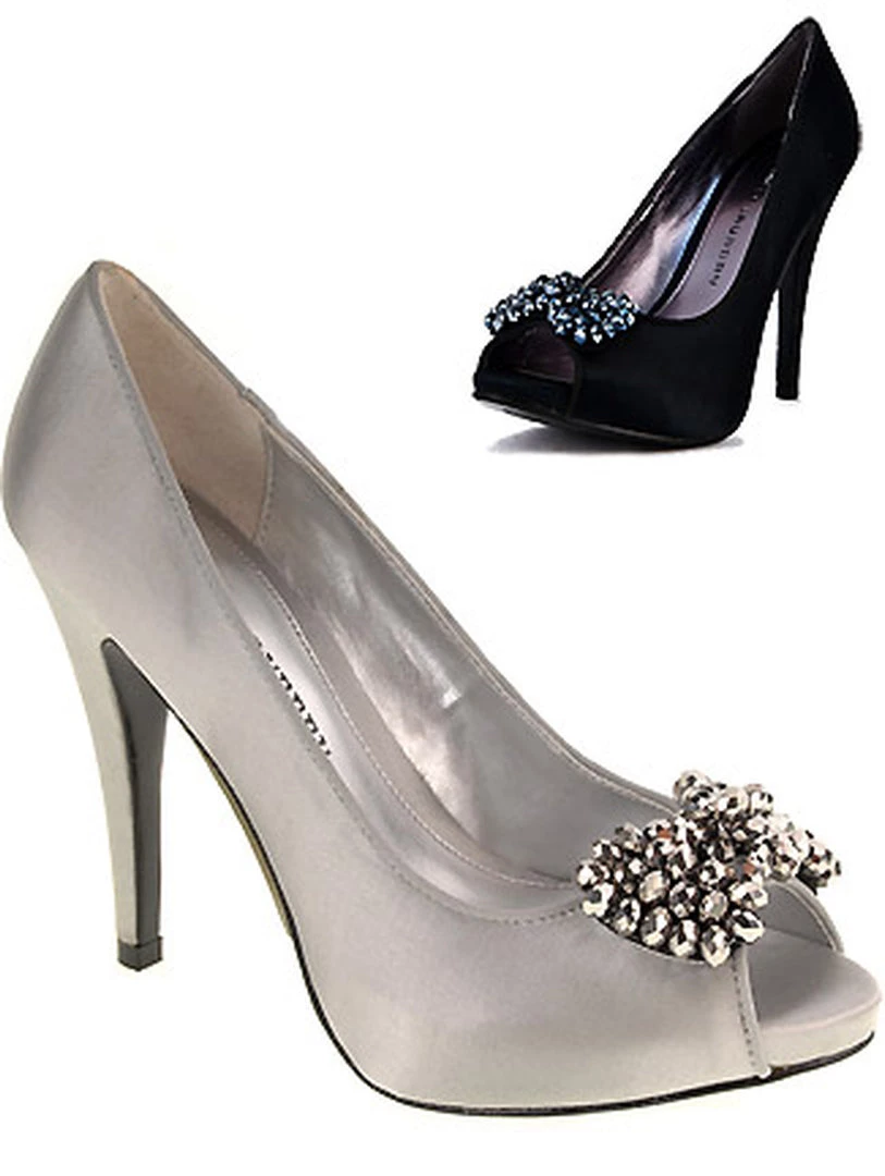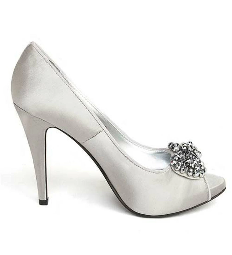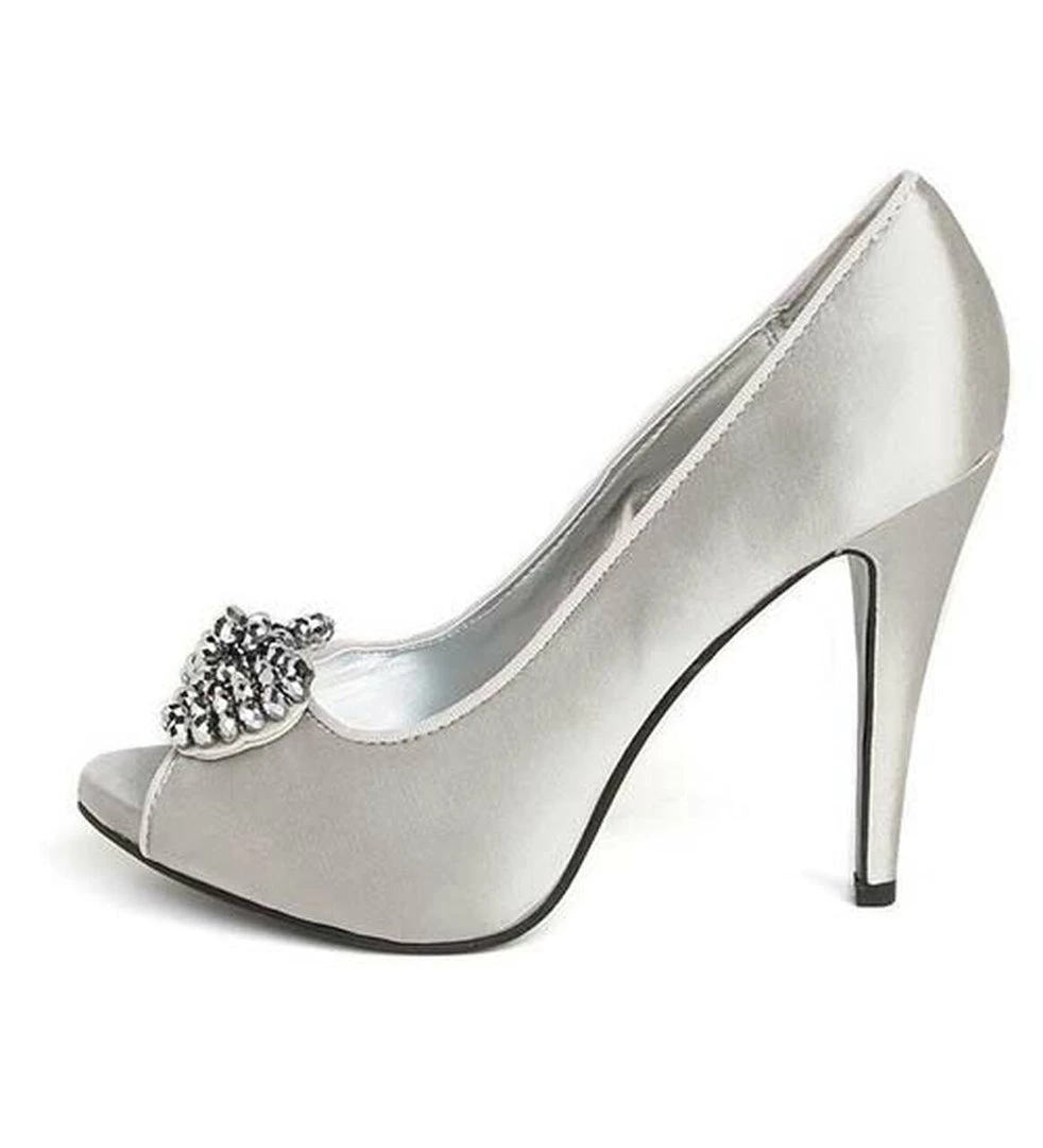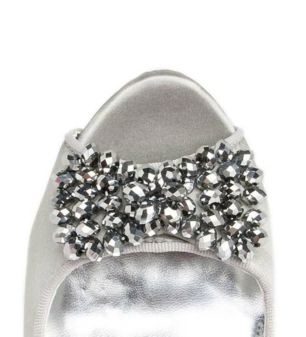 4 ½” High Heel Peep-toe Pump Wrapped in Silver Satin featuring Front Bow Encrusted with Faceted Beads.