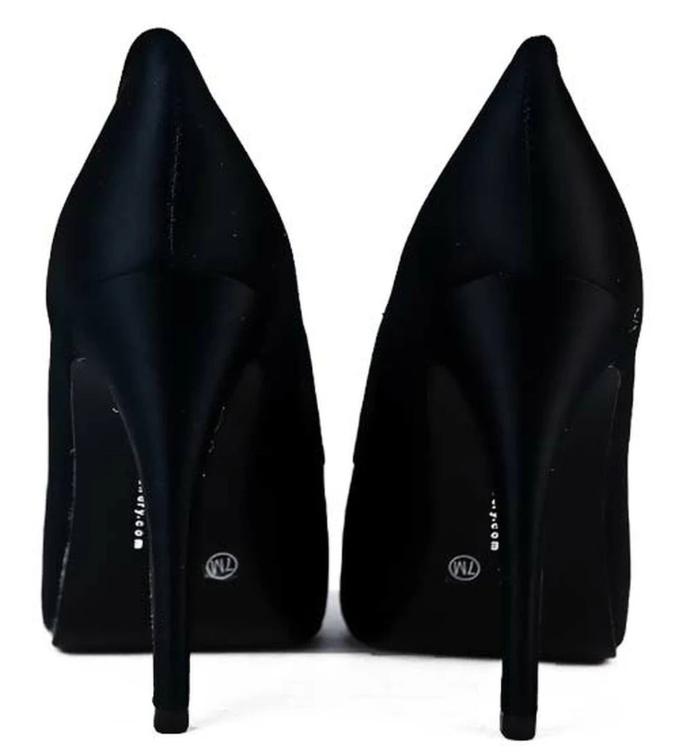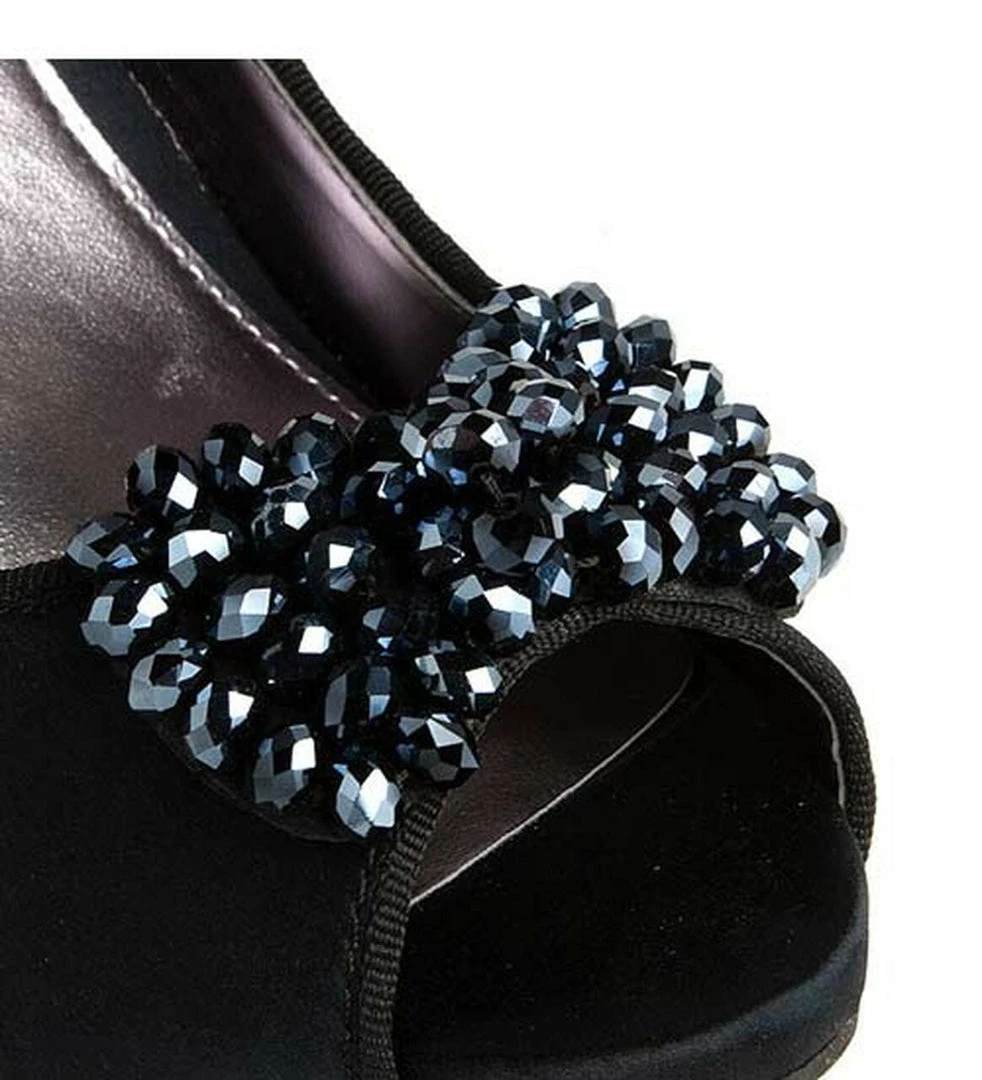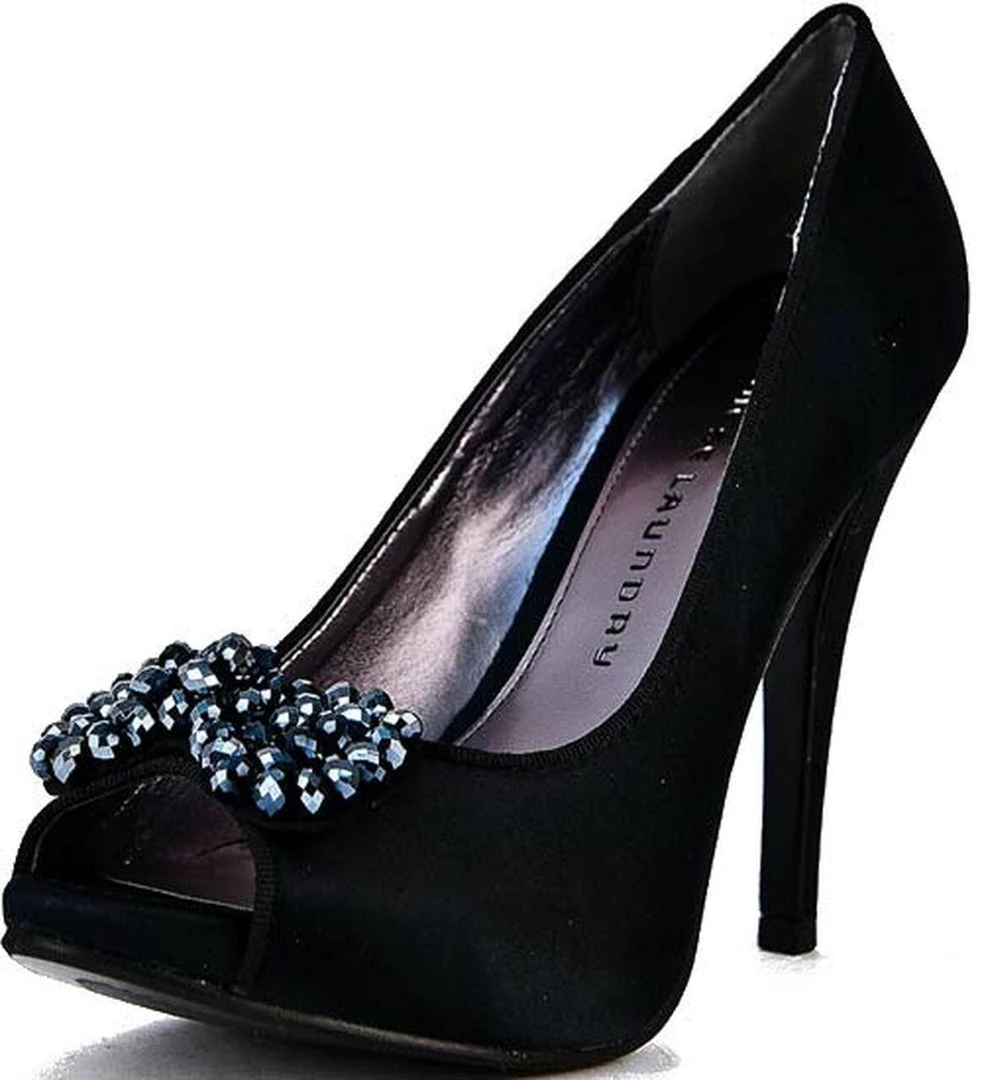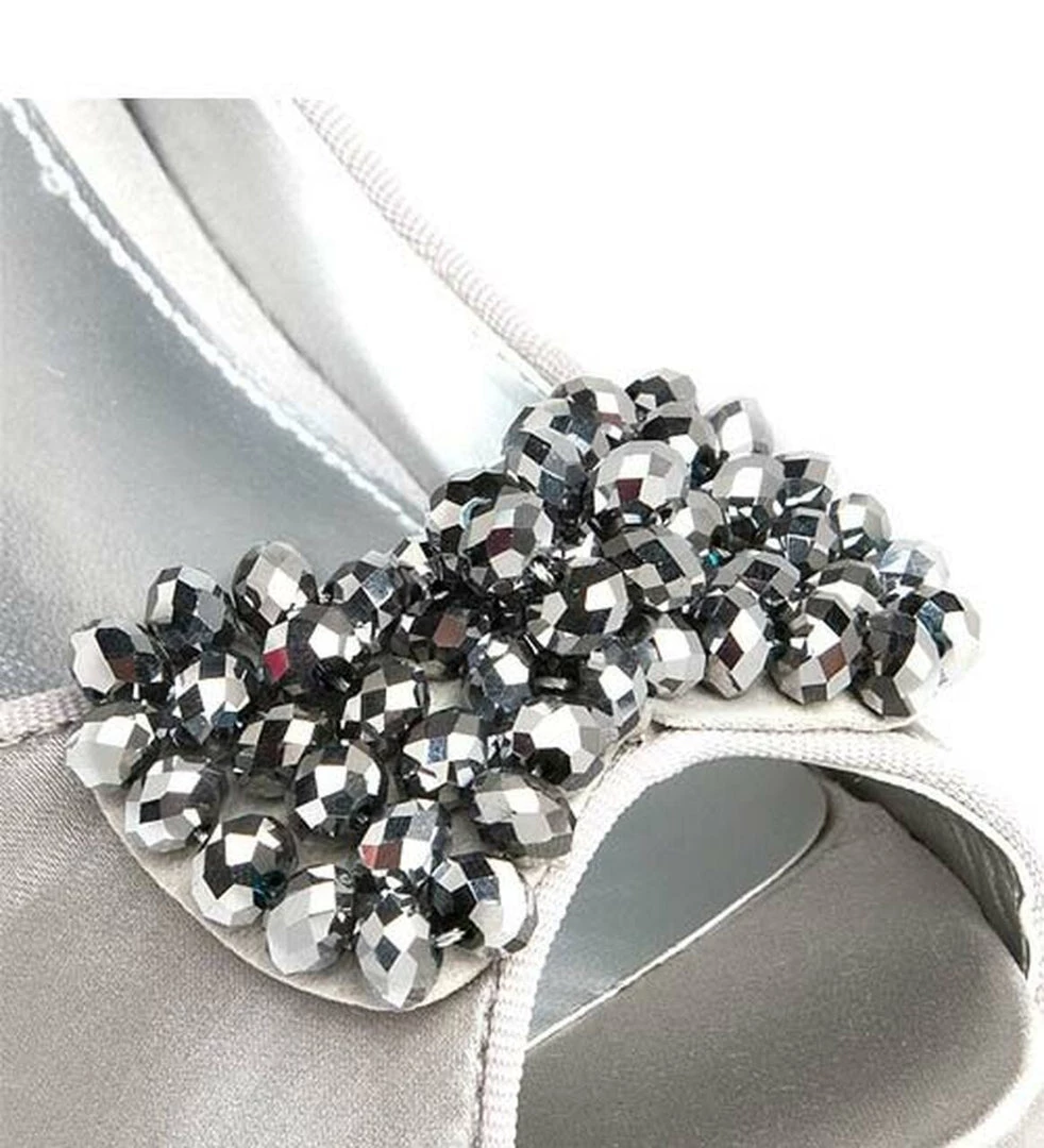4 ½” High Heel Peep-toe Pump Wrapped in Silver Satin featuring Front Bow Encrusted with Faceted Beads.