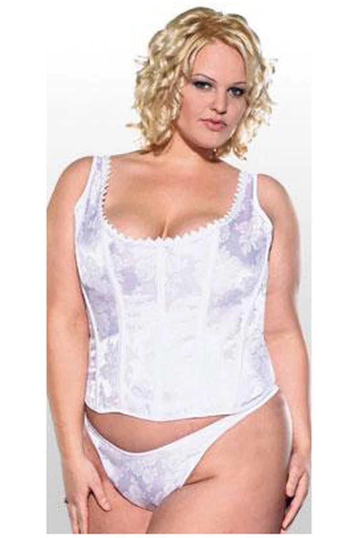 This plus size, black brocade corset features a tank-style silhouette, boning, and a lace-up back. (Thong not included.)