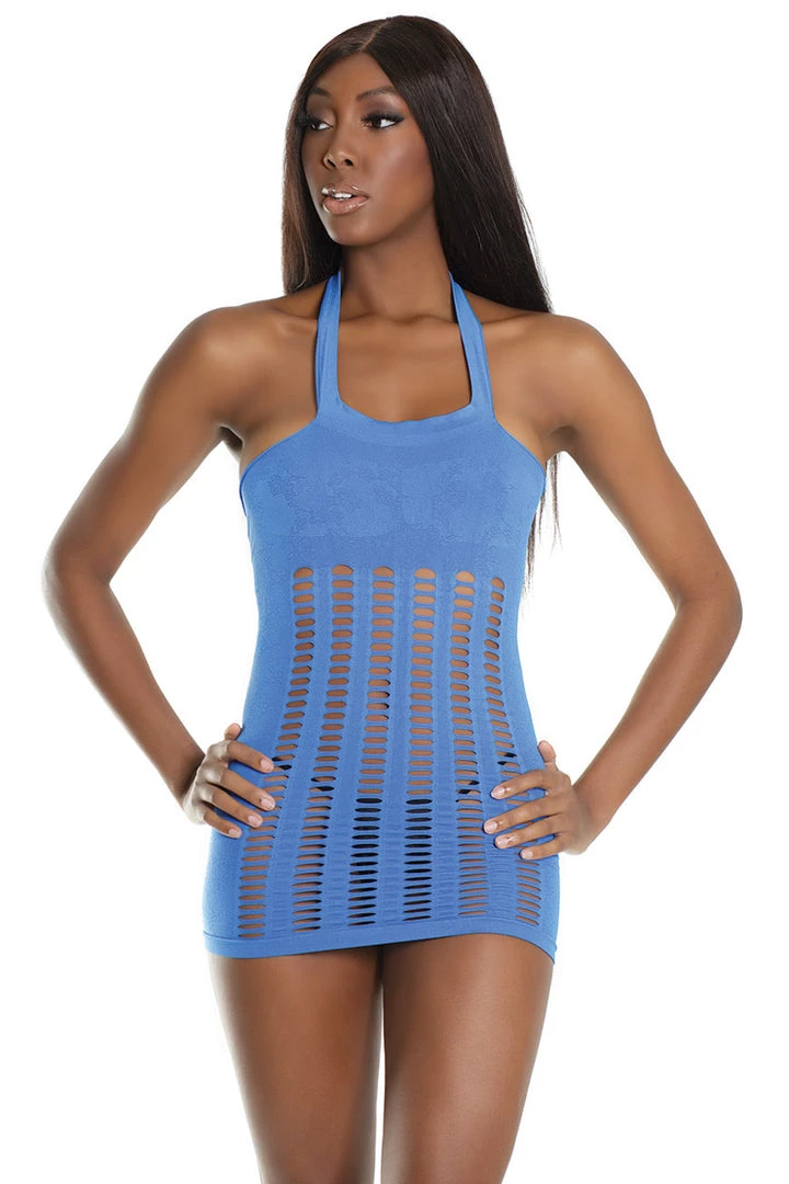 This blue seamless chemise features a net pattern, and spaghetti straps.