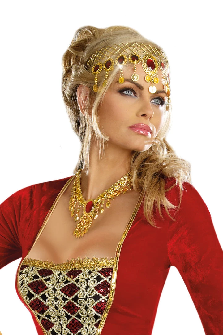 This faux gold and ruby headpiece features gold coin details.