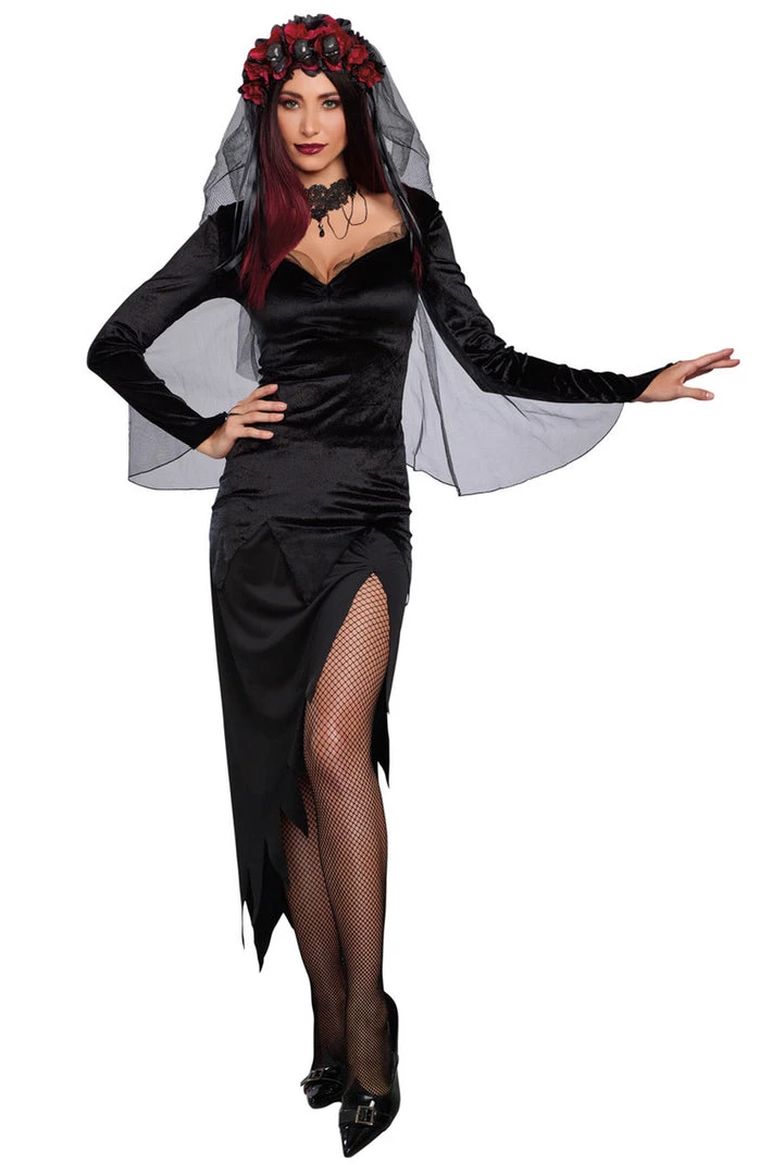 This gothic-style headpiece features a black mesh veil, dark red roses and mini skull appliques.
