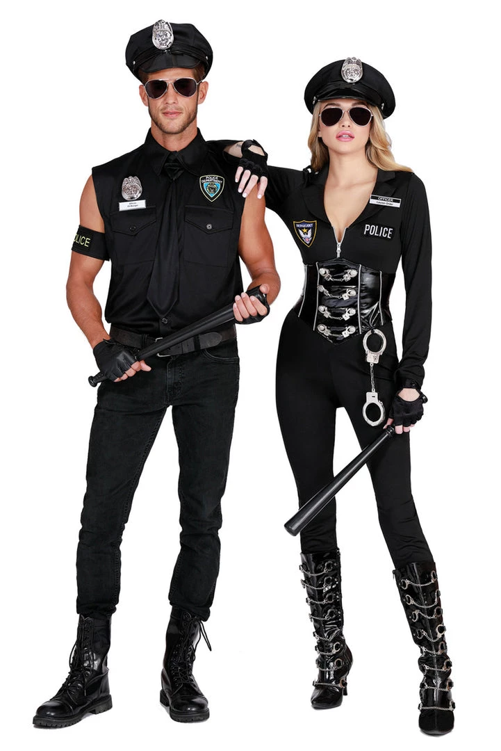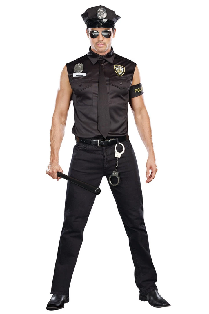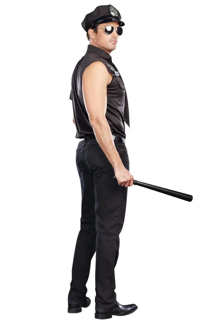 This men’s Dirty Cop Officer costume includes a sleeveless shirt, a removable neck tie, a nameplate, removable police badge, an armband and police hat. (Sunglasses not included.)