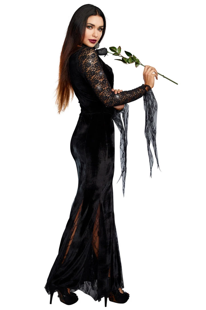 Be the queen of the night in this Frightfully Beautiful costume featuring a long black gown with long sleeves, sheer mesh mermaid skirt bottom, intricate piping and a low cut bust. (Rose not included.)