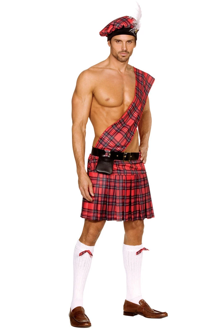 This Men’s Hot Scottie costume features a red gingham print pleated kilt, attached sash, a belt with bag, sock garters and a hat.