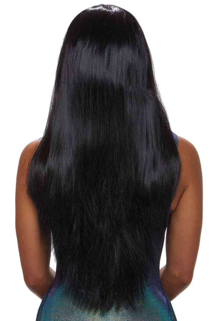 This long black wig features straight locks and a center part.