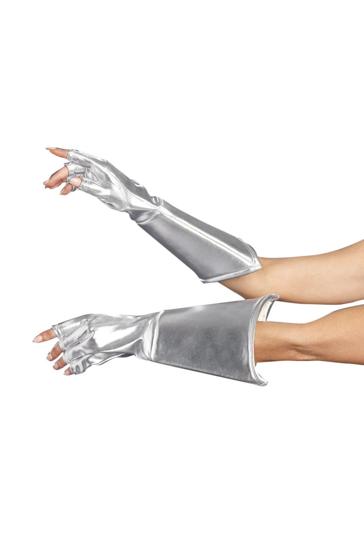 These fingerless, medieval galaxy gloves feature a silver finish.