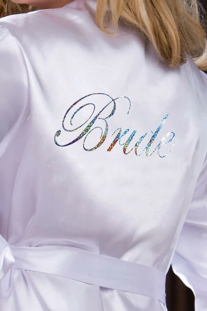 *Charmeuse Robe Set with Attached Belt and “Bride” Silver Heat Transfer on Back