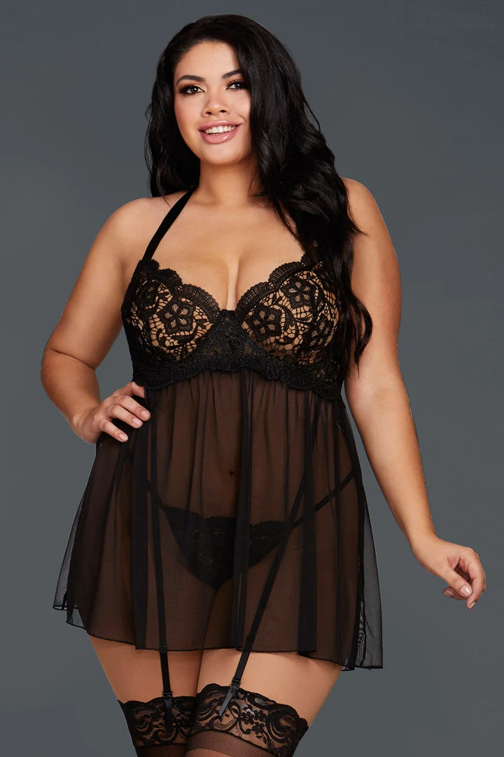This flirty mesh babydoll features unique attached garter straps, embroidered venice lace details, satin halter straps, a hook and eye back and a matching lace thong.