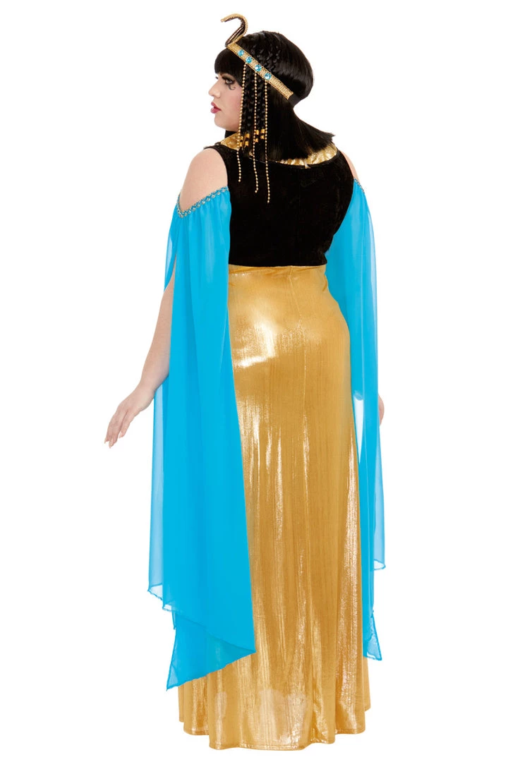 This plus size, captivating Queen Cleopatra costume includes a long gown with a black velvet top, shimmering gold skirt with side slits, a striped waistband, cold shoulder top with long blue chiffon sleeves, a faux leather collar, and belt front panel glitter and jewel details. (Scepter and wig not included.)