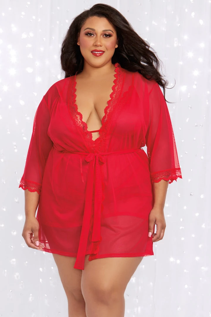 This plus size, rouge mesh set includes a sleepwear chemise with lace trim, a keyhole cut out front, and matching robe with a belted middle.