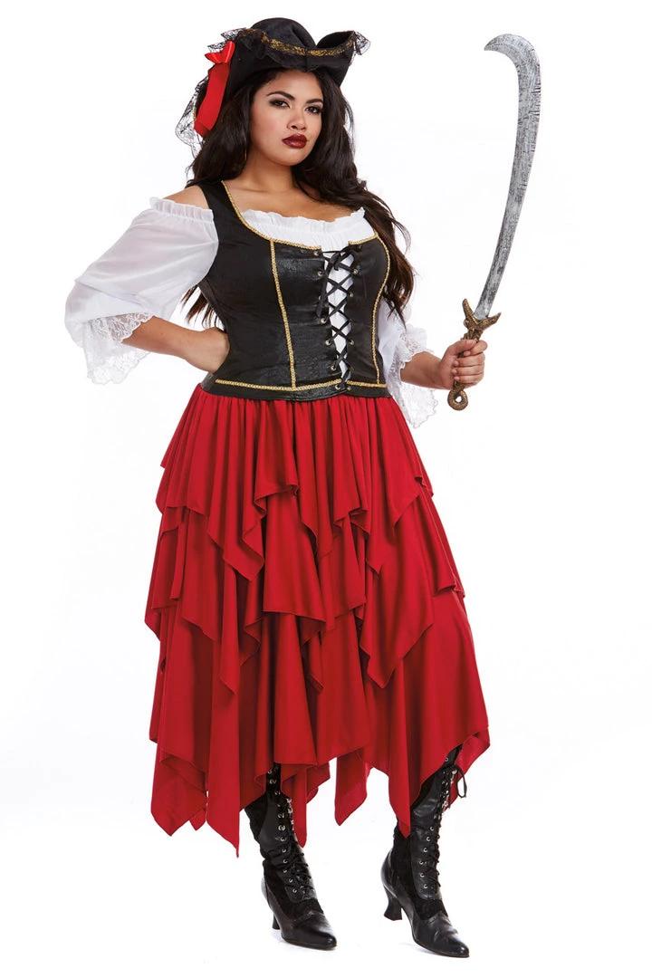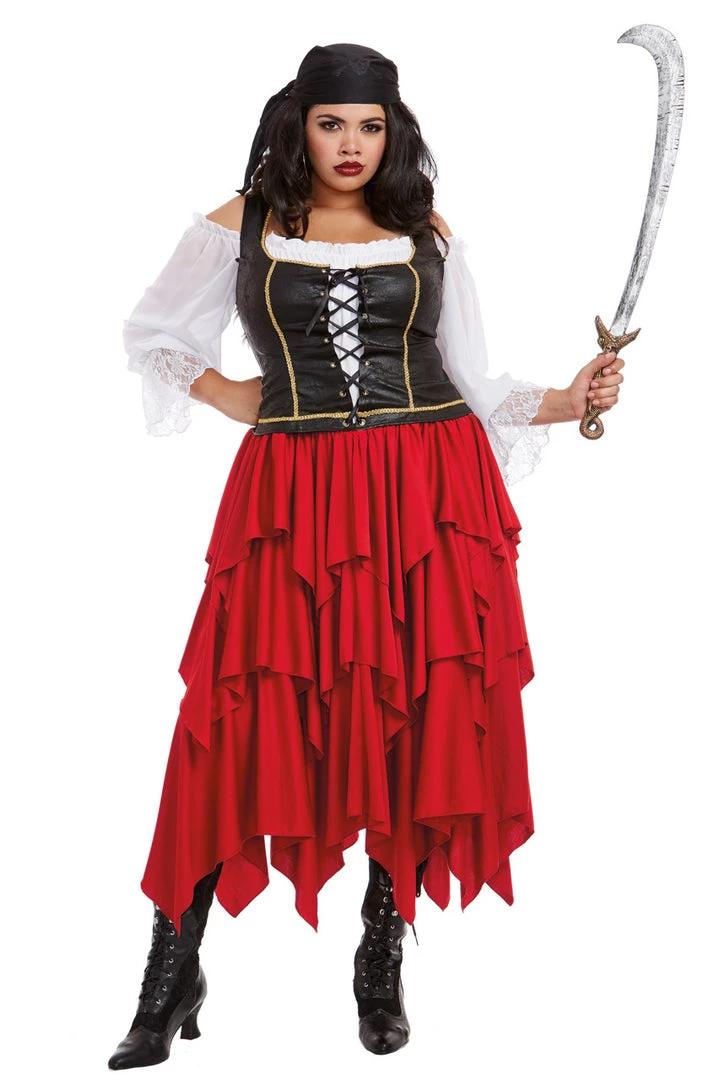 This plus size Ships Ahoy costume features a long pirate dress with off the shoulder peasant top, layered skirted bottom, attached faux leather vest and head scarf.