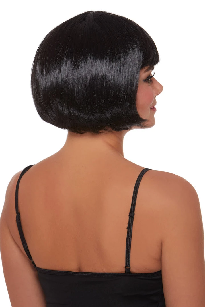 This short black bob wig features swooping bangs.