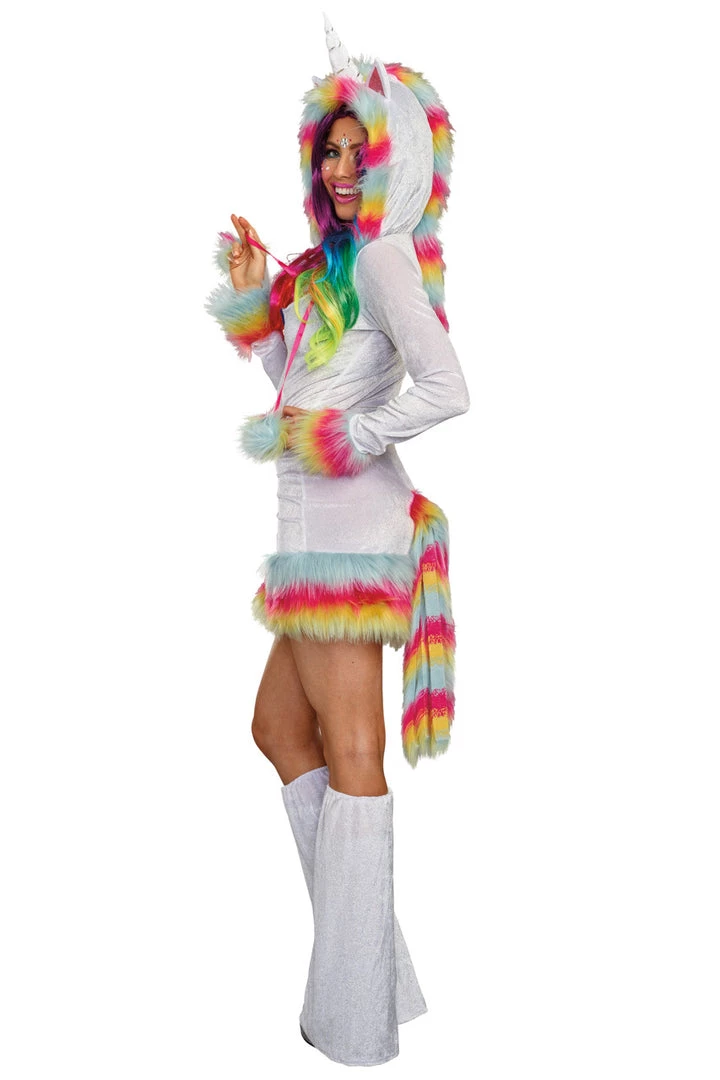 Prance around the party in this Unicorn Beauty costume featuring a white velvet mini dress with a rainbow zip up front, a faux fur rainbow trim, an attached faux fur rainbow tail, an attached hood with a unicorn horn and boot toppers.