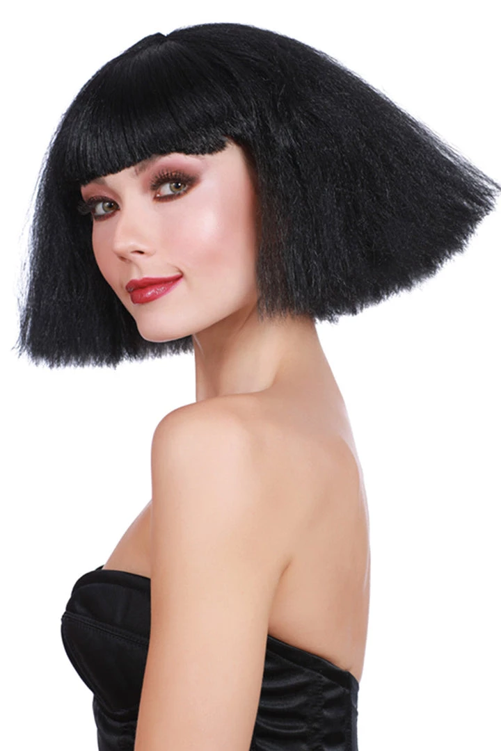 This short, bob-style, blunt cut wig includes blunt cut bangs.