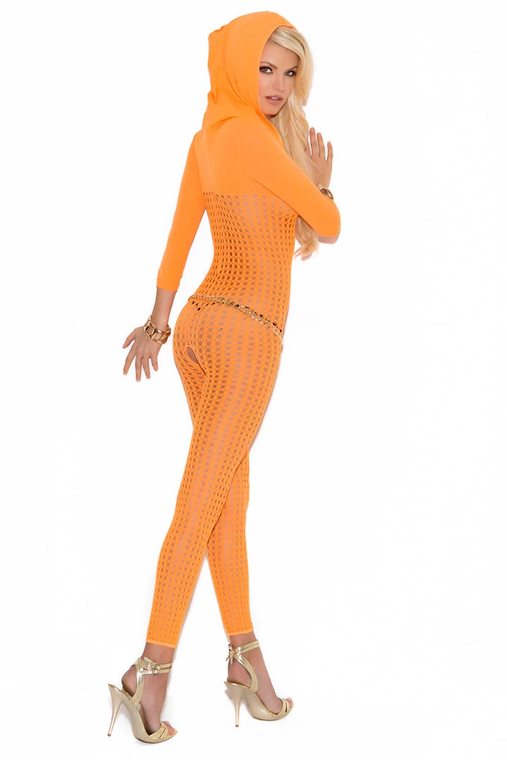 This neon orange, seamless bodystocking features pothole cut outs, an open crotch, 3/4 length sleeves, and an attached hood.