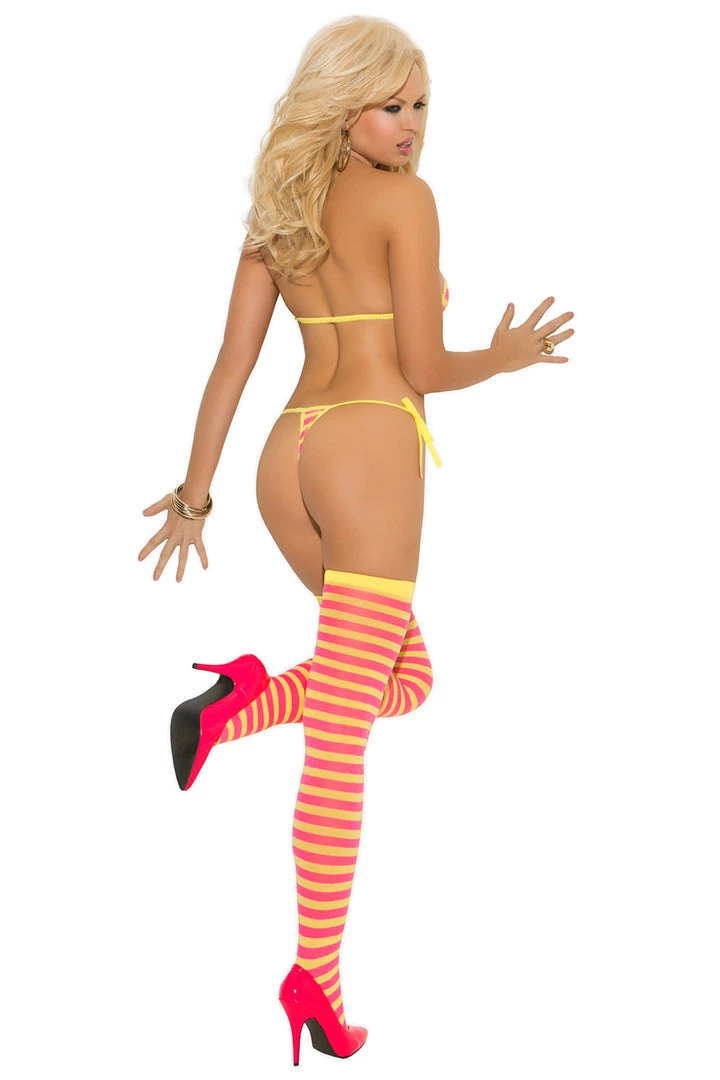 Neon yellow and pink striped set includes a string bra top, tie side thong, and matching stockings.