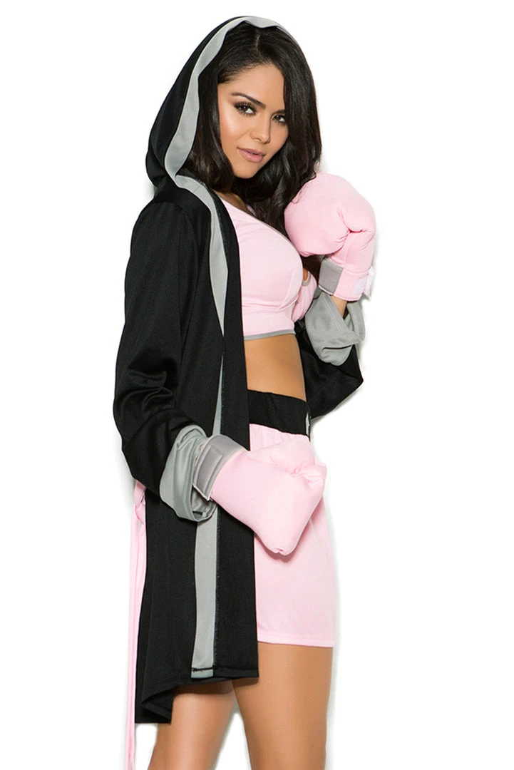 This Prize Fighter costume includes a pink crop top with a low cut bust, pink shorts with “Champ” print, hooded robe, and gloves.