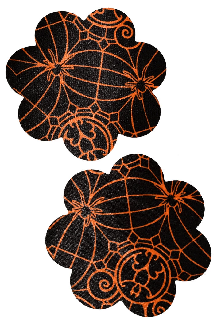 Black and orange spiderweb nipple pasties. Feature self adhesive tape, just peel and stick on clean, dry, oil-free skin.