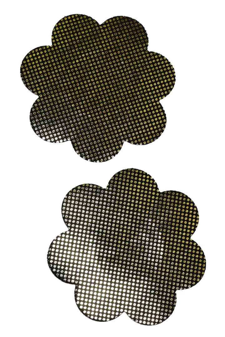 Black and silver chrome dot petal nipple pasties. Feature self adhesive tape, just peel and stick on clean, dry, oil-free skin.