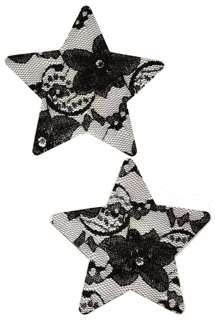 These black floral lace nipple pasties feature star shaped boob stickers with sheer black floral lace over top. Features self adhesive tape, just peel and stick on clean, dry, oil-free skin!