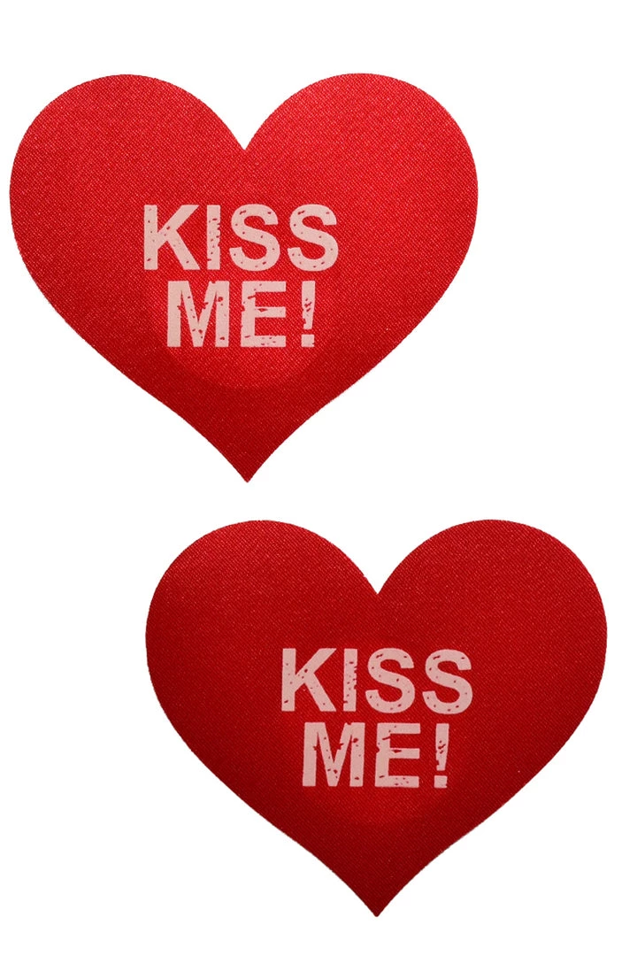 Red Heart Nipple Pasties with white glow in the dark “Kiss Me!” print. Feature self adhesive tape, just peel and stick on clean, dry, oil-free skin.