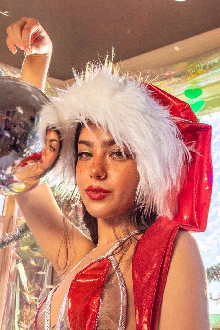 This red metallic Santa hat is the perfect addition to any holiday look.