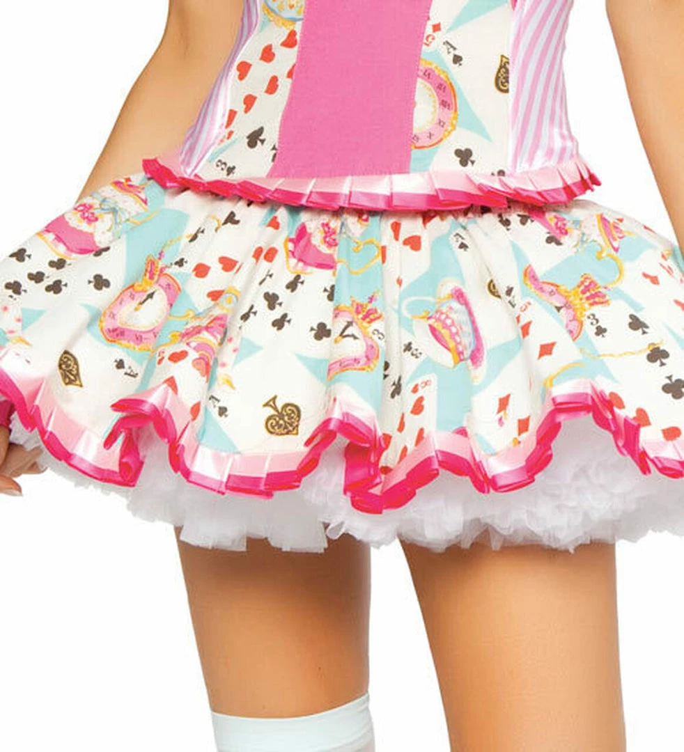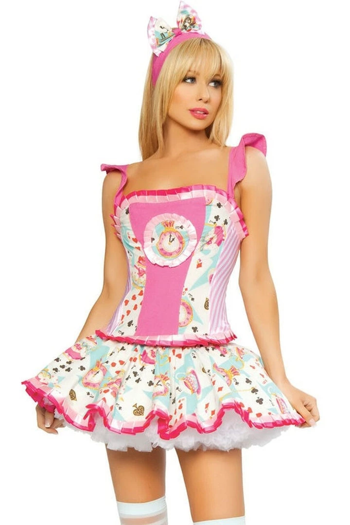 Three Piece After Party Alice Costume includes Lace-up Back Corset with Pleated Trim, Matching Mini Skirt, Brass Key Headband. Made in USA, Shown with R1451 Two Layer Petticoat not included.