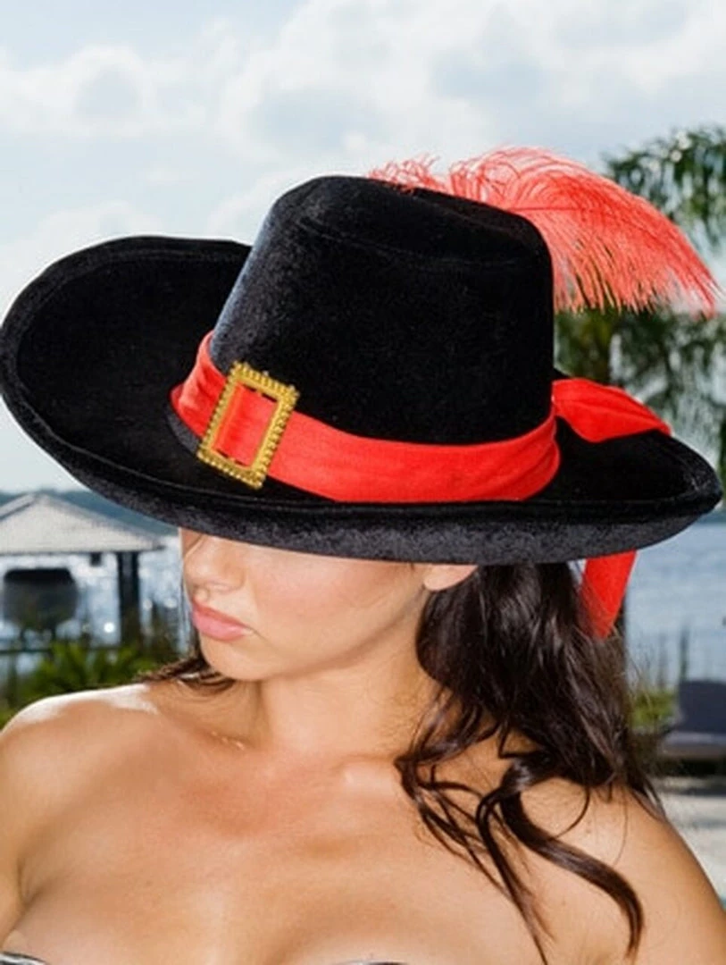 Felt Musketeer Hat with Buckle, Ribbon, and Feather Detail.