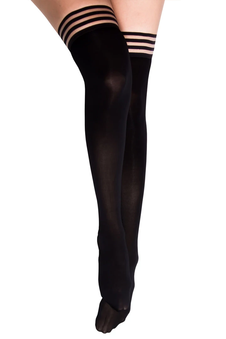 The worry-free solution to your thigh high woes! These Opaque Black Stay Up Thigh Highs feature quality nylon thigh high stockings with no slip grip banded thighs. These thigh high stay up stockings feature a strong, yet gentle, silicone-grip band that keeps your stockings in place all day and all night! Best of all, these thigh highs are built to last with flirty patterns for either work or play.