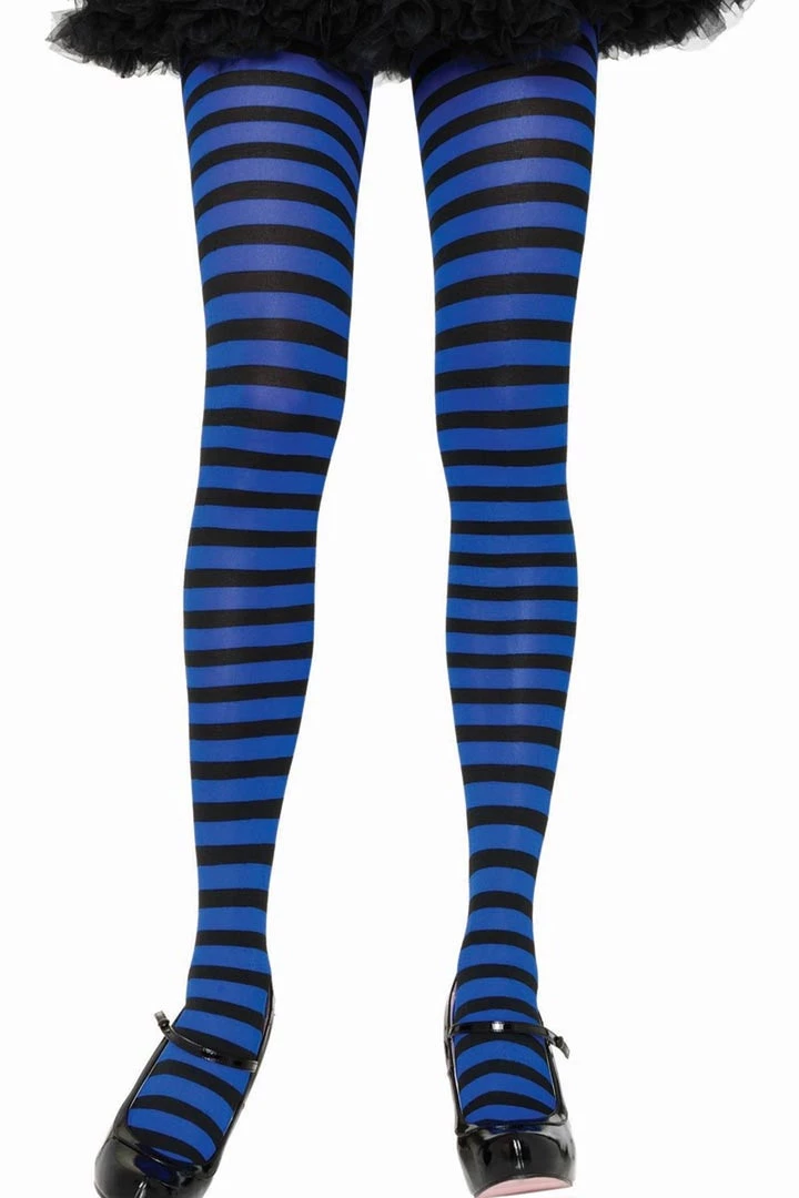 Make a statement with your legs featuring these Black & Royal Blue Striped Pantyhose with opaque nylon stretch fabric and pantyhose with feet.