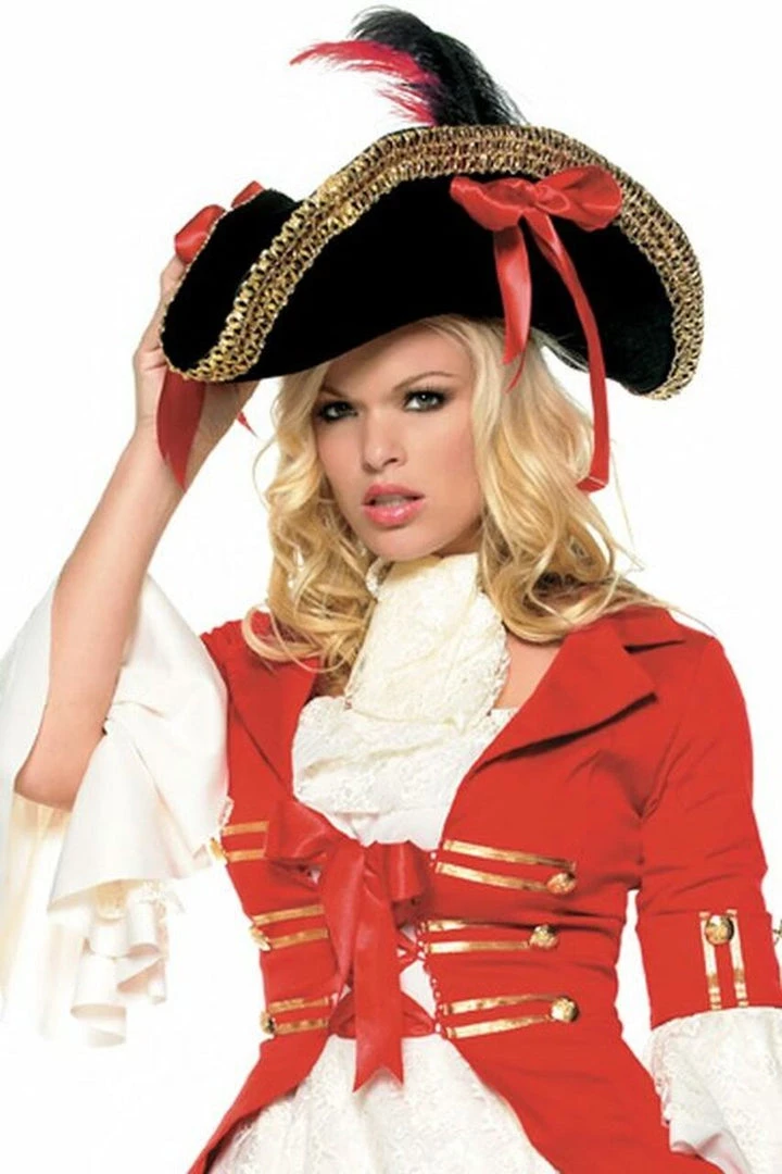 Pirate Hat with Thick Gold Trim and Side Ribbons Topped with Ostrich Feathers.
