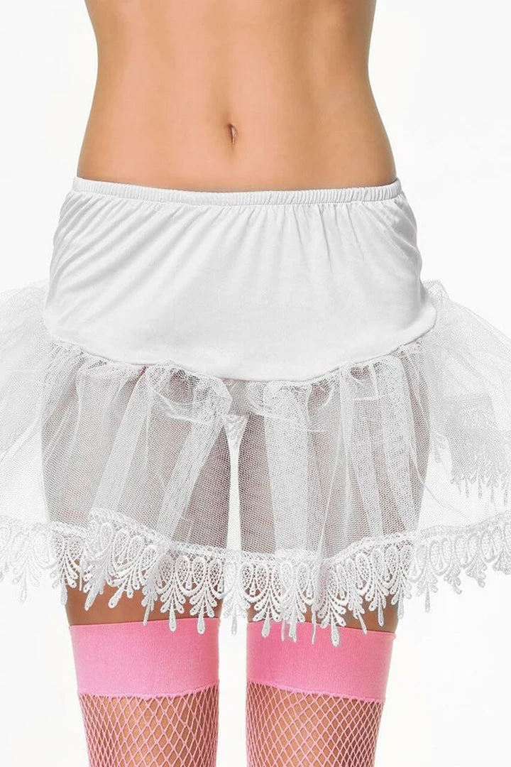 Tulle petticoat with satin waistband and delicate teardrop lace trim. Very pretty and adds fluff to that special dress or costume.