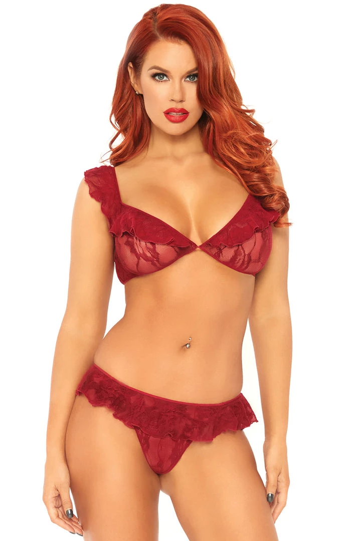 This two-piece set includes a lace ruffle bralette and a matching ruffle thong.