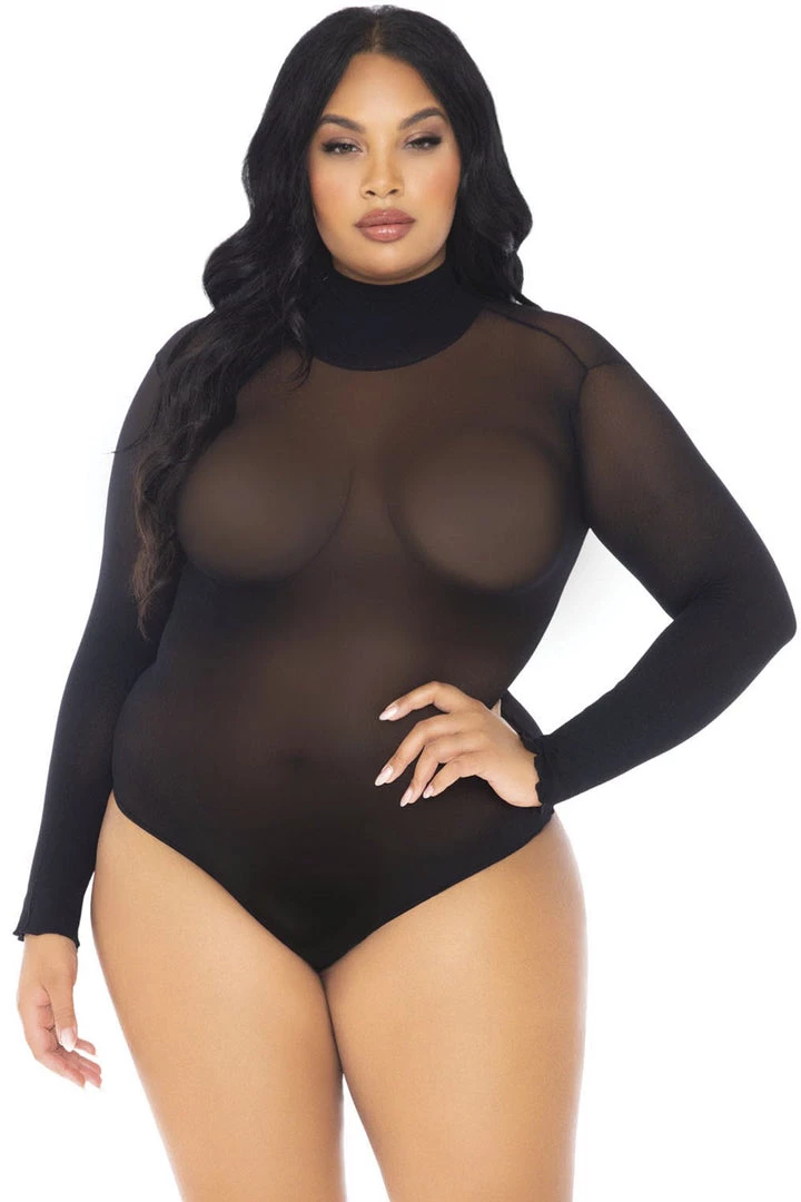 This plus size, opaque, high neck bodysuit features long sleeves and a snap crotch closure.