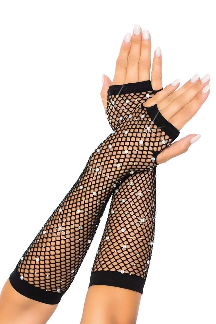 Add a touch of sparkle to your outfit with these glamorous Rhinestone Fishnet Arm Warmers that include a soft stretch nylon material with fishnet pattern and attached rhinestones.